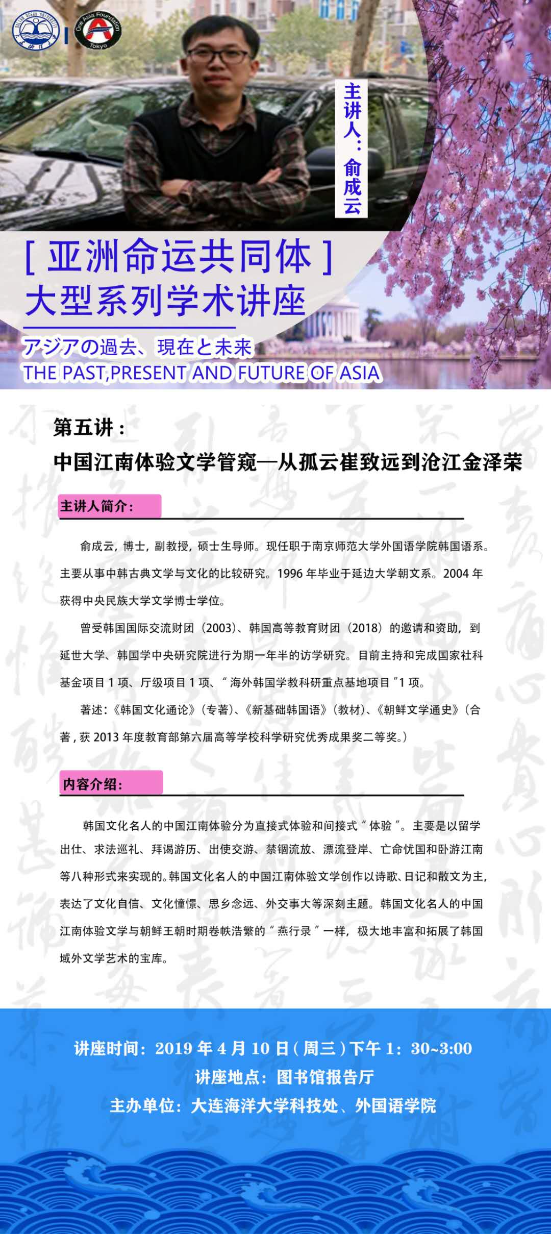 俞 成云 副教授 | 南京師范大學(xué) | 中韓古典文學(xué)與文化比較研究 | 4月10日 星期三 | 13:30~15:00 |