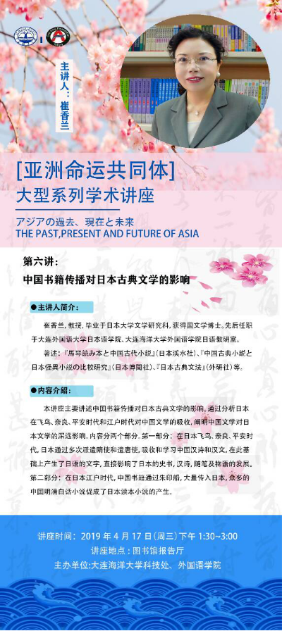 崔 香蘭 教授 | 大連東軟信息學(xué)院 | 日本古典文學(xué)與文化比較研究 | 4月17日 星期三 | 13:30~15:00 |