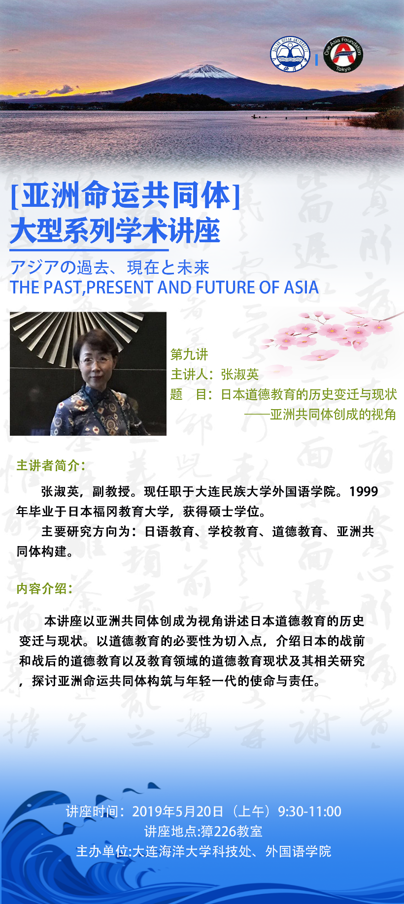 張淑英 副教授 大連民族大學 | 日本道德教育的變遷于現(xiàn)狀—亞洲共同體創(chuàng)城的視角 | 5月20日(周一)上午9:30-11:00 | 外國語學院 崔松子 |