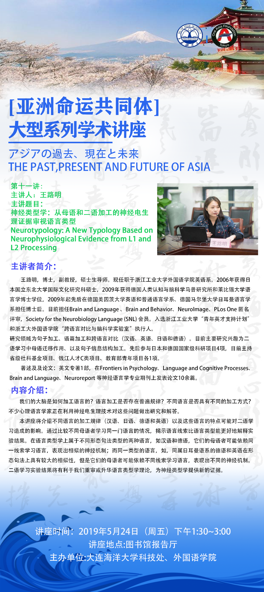 王路明 副教授 浙江工業(yè)大學 | 神經(jīng)類型學:從母語和二語加工的神經(jīng)電生理證據(jù)審視語言類型 Neurotypology: A New Typology Based on Neurophysiological Evidence from L1 and L2 Processing | 5月24日(周五)下午1:30-3:00 | 外國語學院 崔松子 |