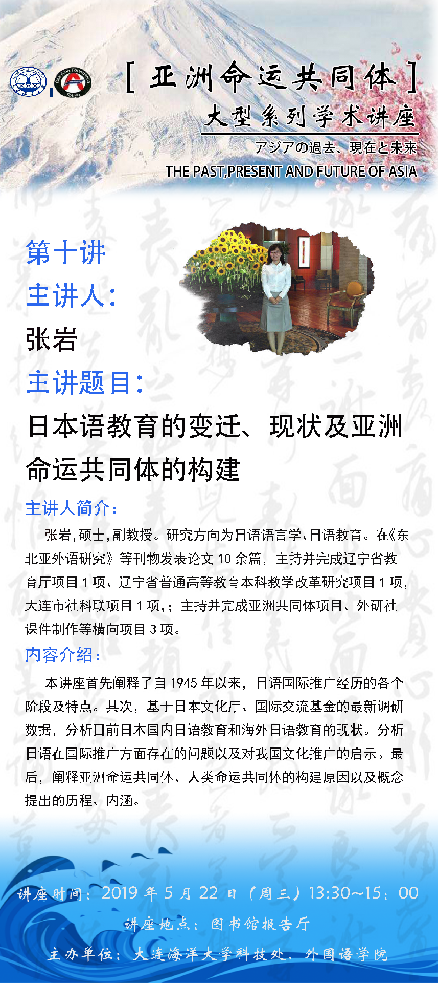 張巖 副教授 東軟信息學院 | 日本語教育的變遷、現(xiàn)狀及亞洲命運共同體的構建 | 5月22日(周三)下午1:30-3:00 | 外國語學院 崔松子 |