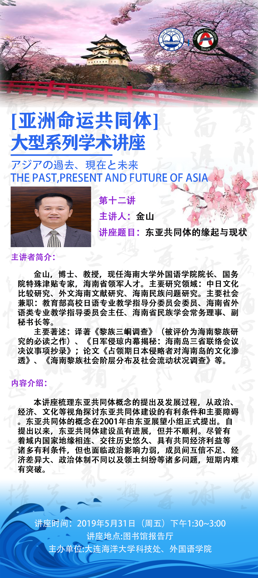 金山 教授 海南大學 | 東亞共同體的起源于現(xiàn)狀 | 5月31日(周五)下午1:30-3:00 | 外國語學院 崔松子 |