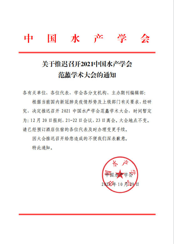 各位老師、同學(xué): 2021中國(guó)水產(chǎn)學(xué)會(huì)范蠡學(xué)術(shù)大會(huì)原定于2021年11月10-11日在重慶舉辦,因疫情推遲到12月20日?qǐng)?bào)到,21-22日會(huì)議,地點(diǎn)不變,請(qǐng)參會(huì)者及時(shí)變更預(yù)定的住宿和機(jī)票。關(guān)于召開(kāi)2021中國(guó)水產(chǎn)學(xué)會(huì)范蠡學(xué)術(shù)大會(huì)的通知.pdf關(guān)于推遲召開(kāi)2021年中國(guó)水產(chǎn)學(xué)會(huì)范蠡大會(huì)的通知.png