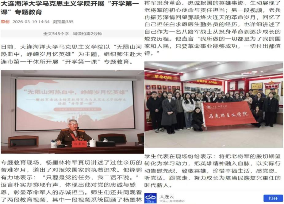 近日,大連云客戶端對(duì)我校馬克思主義學(xué)院開(kāi)展的“開(kāi)學(xué)第一課”專題教育活動(dòng)進(jìn)行了宣傳報(bào)道。