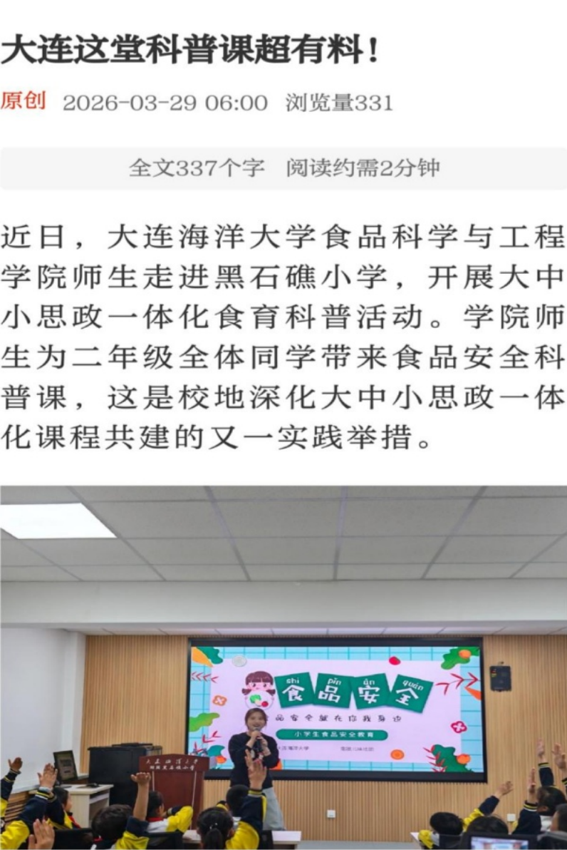 近日,大連云媒體平臺以《大連這堂科普課超有料!》為題,報道了我校食品科學與工程學院走進附屬黑石礁小學,開展大中小思政一體化食育科普活動。
