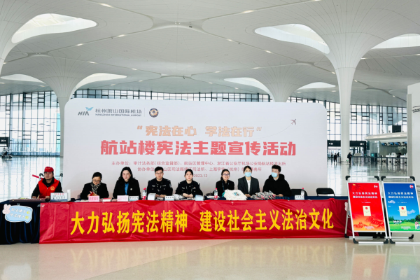 12月27日,為全面貫徹黨的二十大精神,深入學習宣傳貫徹習近平法治思想和習近平文化思想,航站區中心聯合審計法務部、機場公安、靖江司法所、上海宇鈞(杭州)律師事務所一同開展憲法主題宣傳活動。