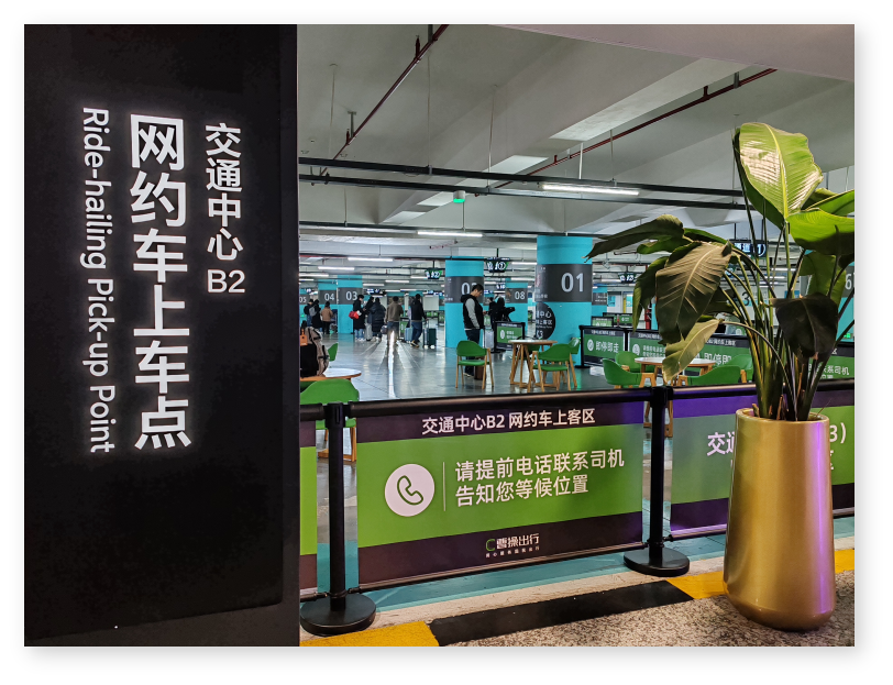 The pick-up area for online ride-hailing vehicles is equipped with a passenger rest area, which provides facilities such as rest tables and chairs, vending machines, drinking water, and smart screens displaying information on the arrival of online ride-hailing vehicles for passengers to use.